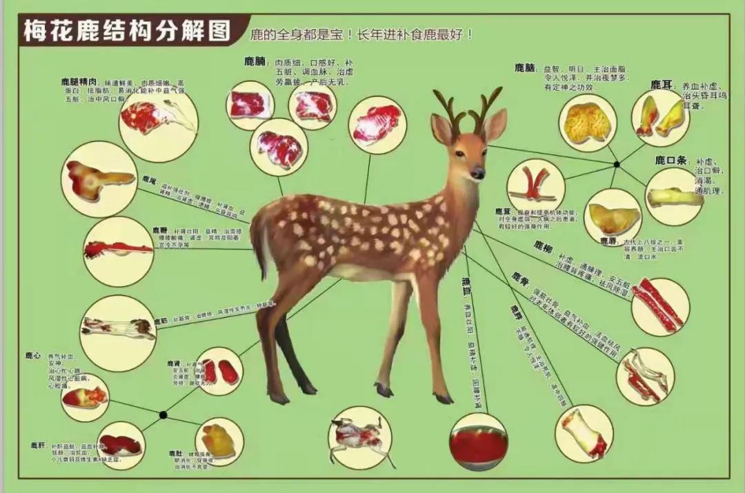 鹿是我國傳統的名貴藥用動物,漢代時就有“鹿身百寶”的說法,是靈丹妙藥的象征?!侗静菥V目》記載鹿茸、鹿角、鹿角膠、鹿角霜、鹿血、鹿腦、鹿尾、鹿腎、鹿筋、鹿脂、鹿肉、鹿頭肉、鹿骨、鹿齒、鹿髓等都可入藥...